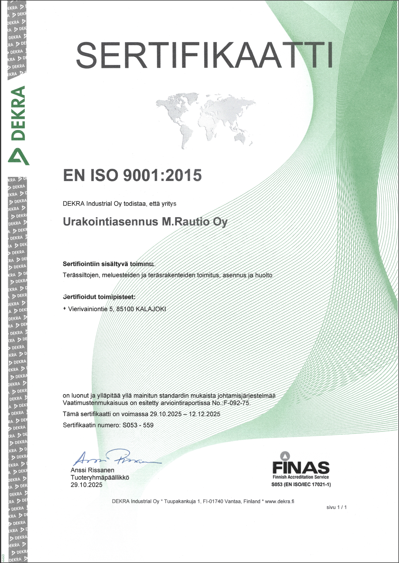 - Johtamisjärjestelmän on sertifioinut ISO 9001: 2015 mukaisesti Dekra Industrial Oy.
